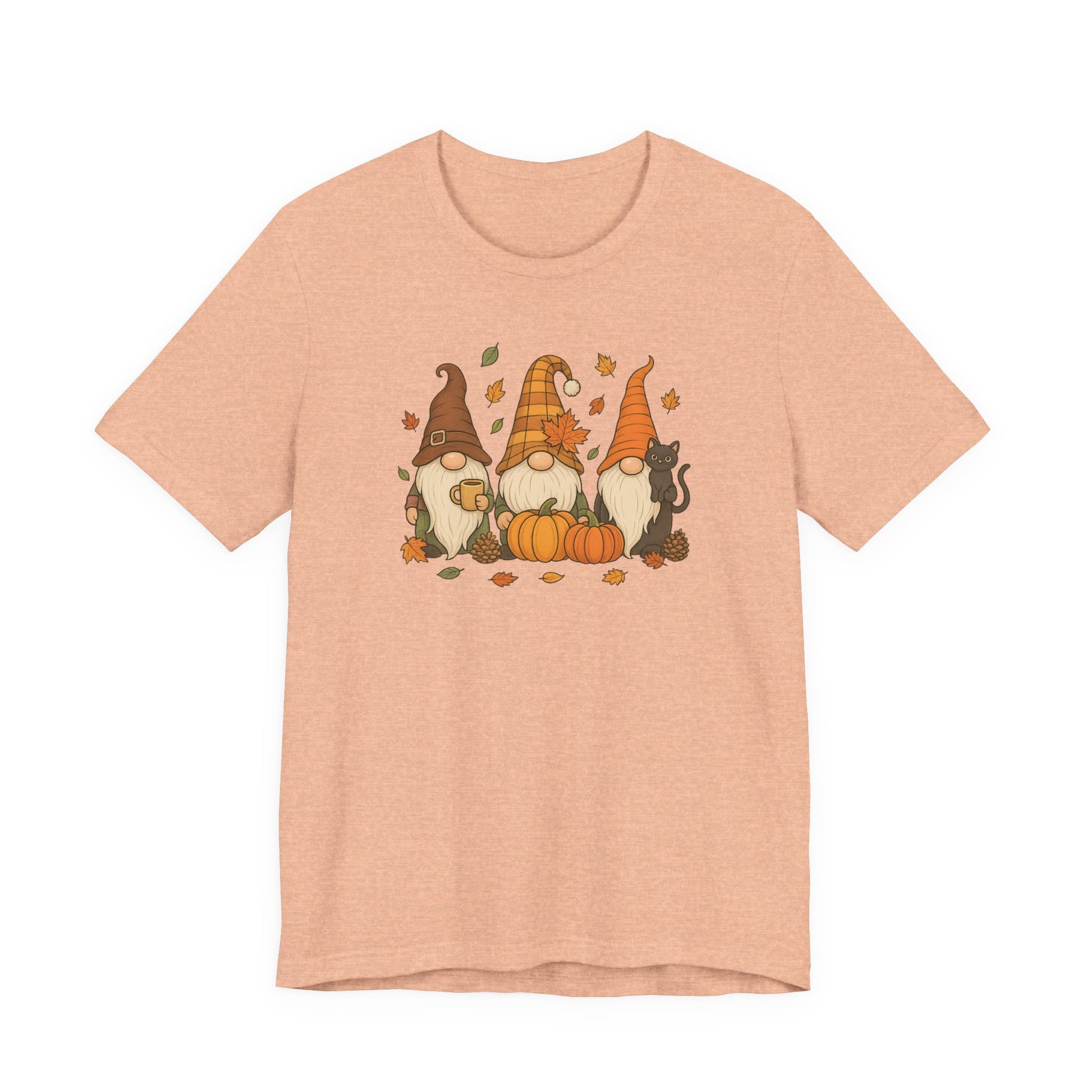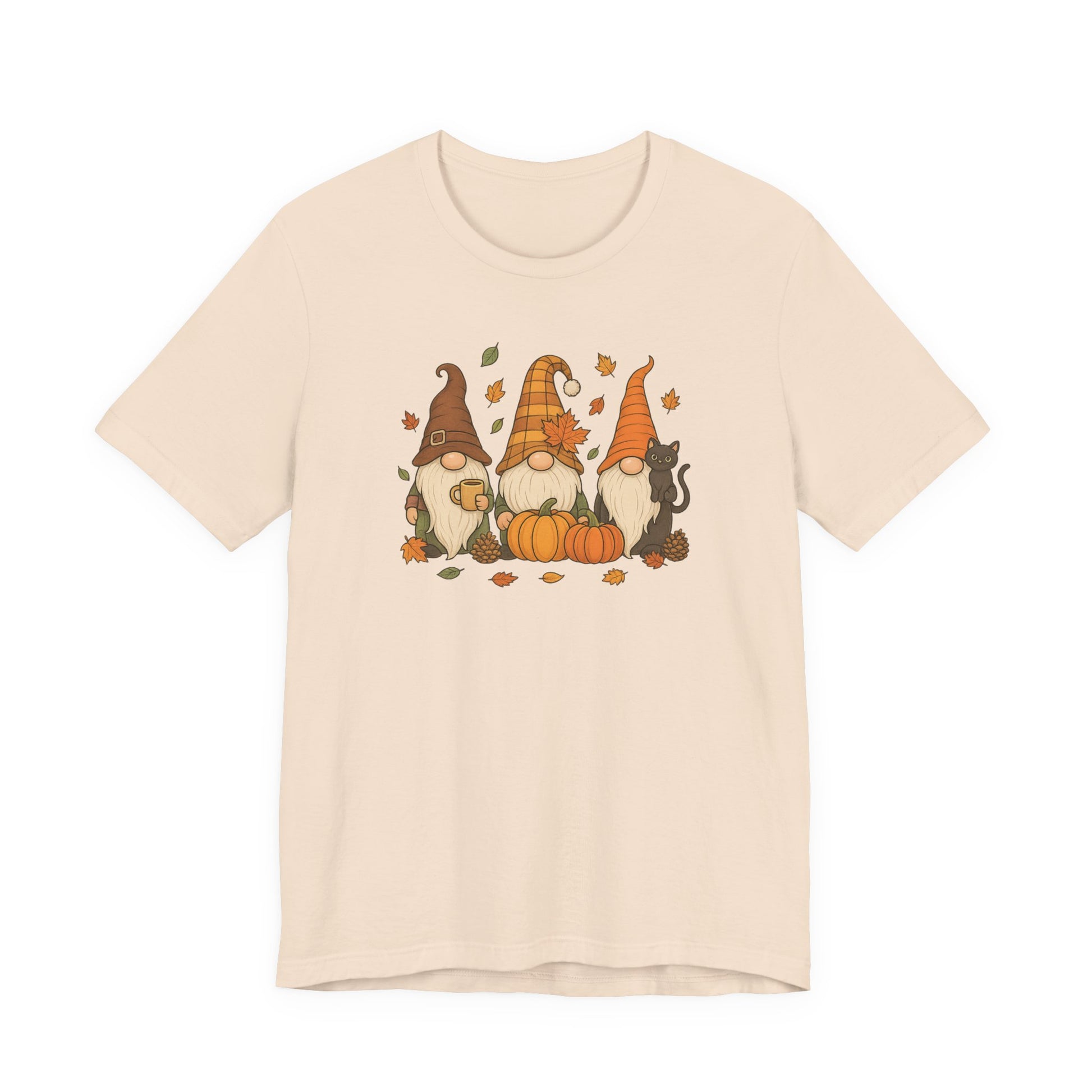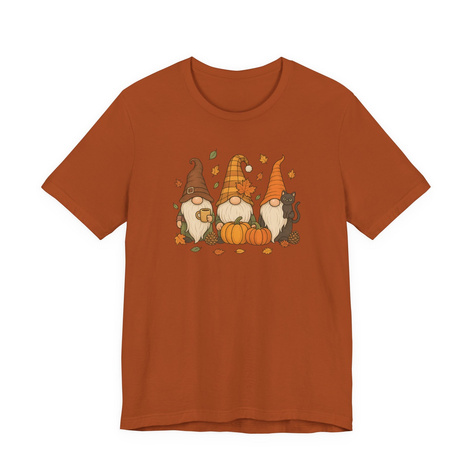 This shirt features a trio of charming autumn gnomes surrounded by all the classics: warm tones, leaves, and that crisp fall vibe everyone pretends they invented. Each gnome brings its own little personality, giving the design a playful, cozy look without losing that traditional harvest feel. It’s an easygoing, festive tee perfect for anyone who likes their fall style cute, simple, and straight out of a storybook.
