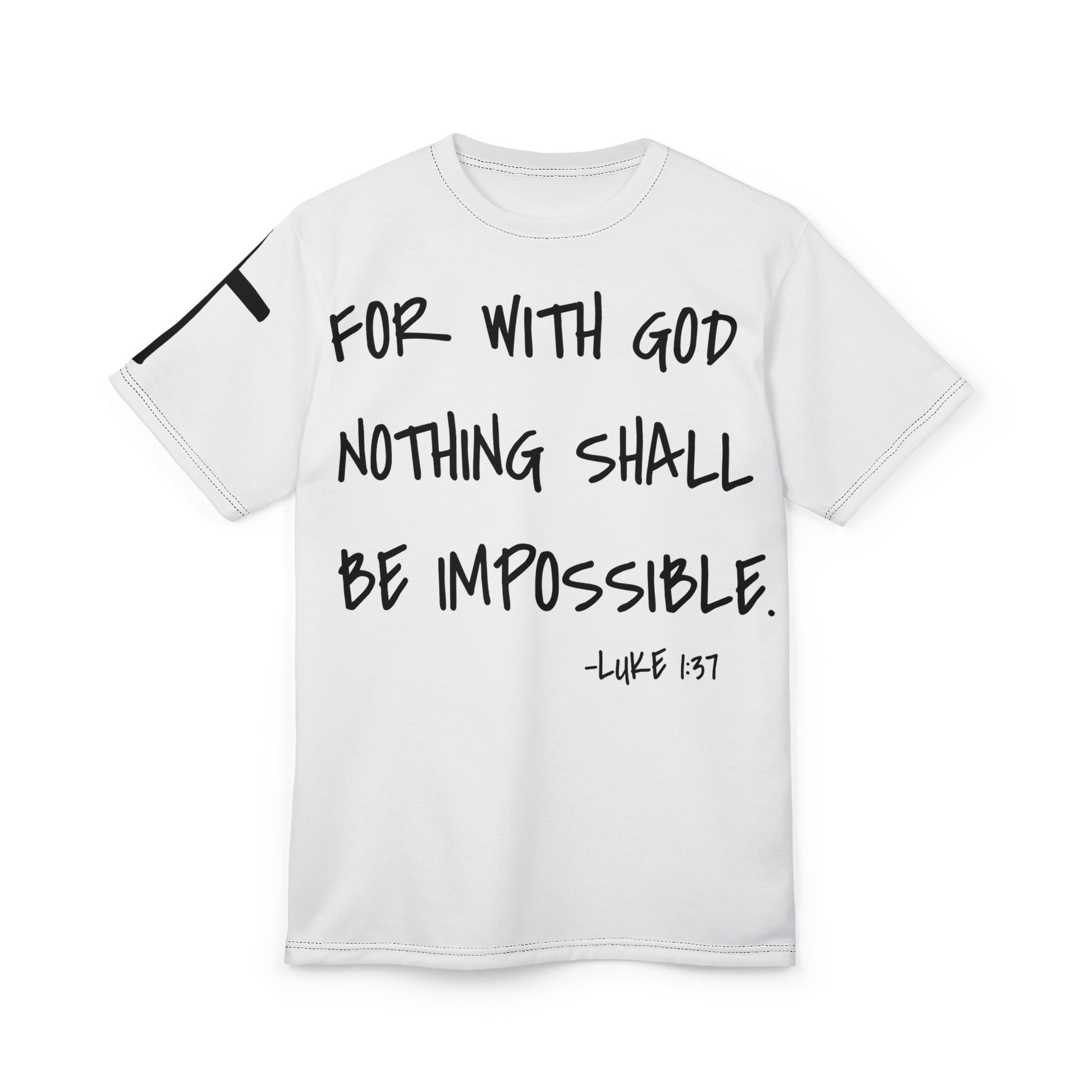 Embrace a message of hope and inspiration with this unisex cut & sew tee. Crafted from 100% polyester, this shirt is not only soft and durable but also quick-drying, making it perfect for everyday wear or special occasions. The motivational phrase, 'For with God nothing shall be impossible' adds a meaningful touch that resonates with those on a faith journey. Ideal for casual outings, spiritual gatherings, or as a thoughtful gift for friends and family, this tee is a perfect fit for religious holidays, celebrations, and personal milestones. Whether you're attending a church event or simply enjoying a day out, this shirt seamlessly combines comfort and style, making it a versatile addition to any wardrobe. Perfect for believers, faith advocates, and anyone seeking to spread positivity, this shirt brings encouragement wherever you go.