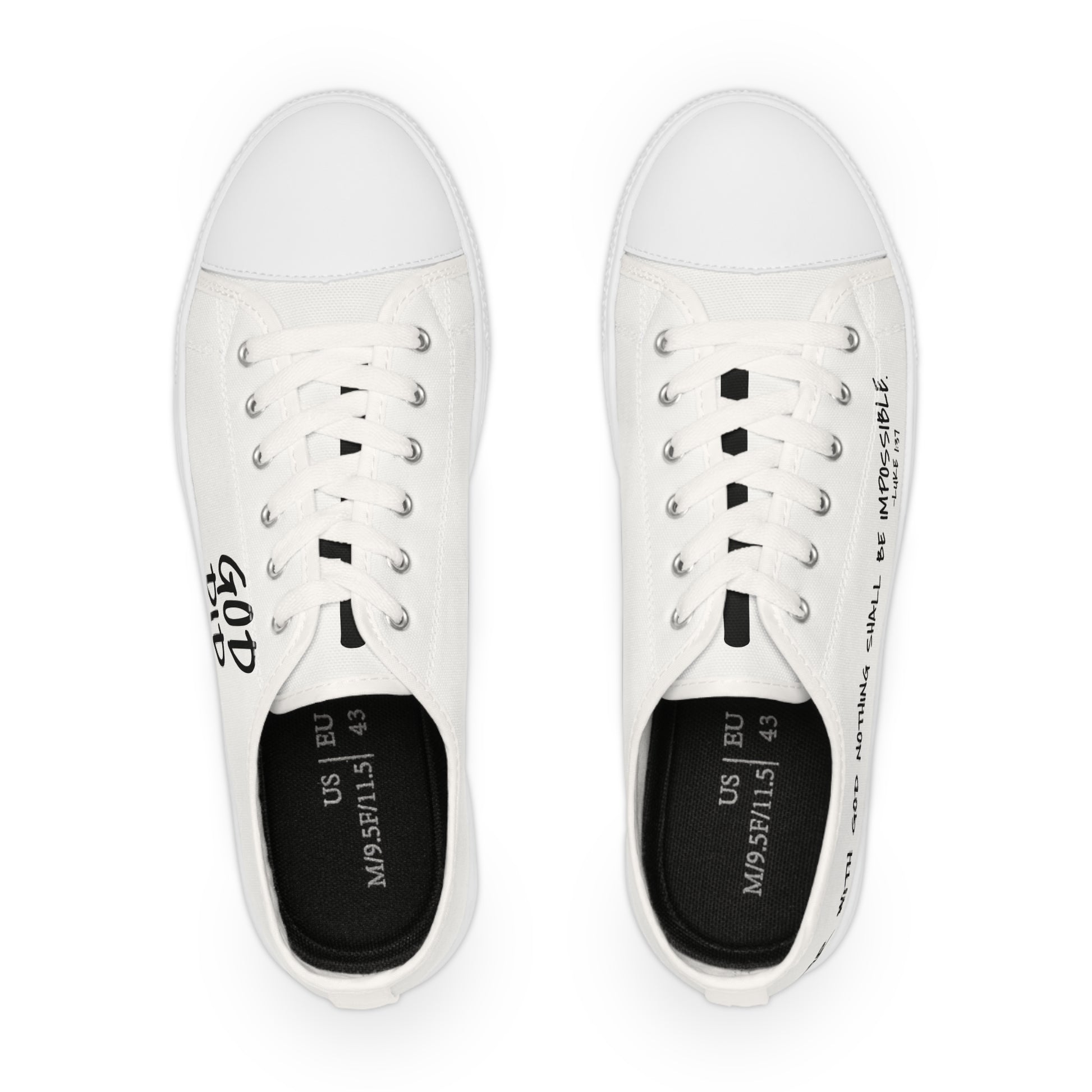 Faith hits the pavement with these men’s low-top sneakers — clean, bold, and built to move with purpose. Featuring “God Did” on the left shoe and Luke 1:37 — “For with God nothing shall be impossible” — on the right, every step becomes a quiet statement of belief and determination.