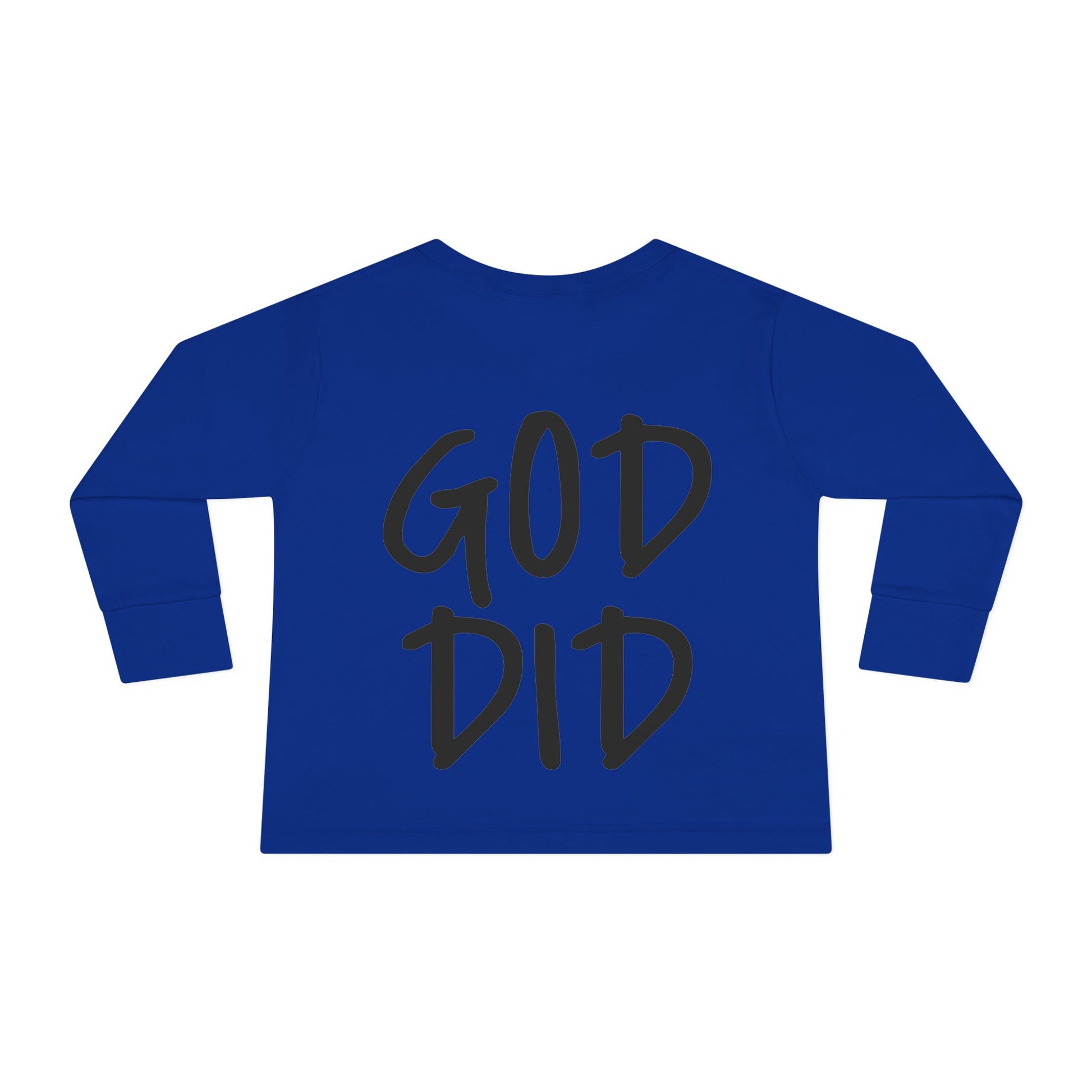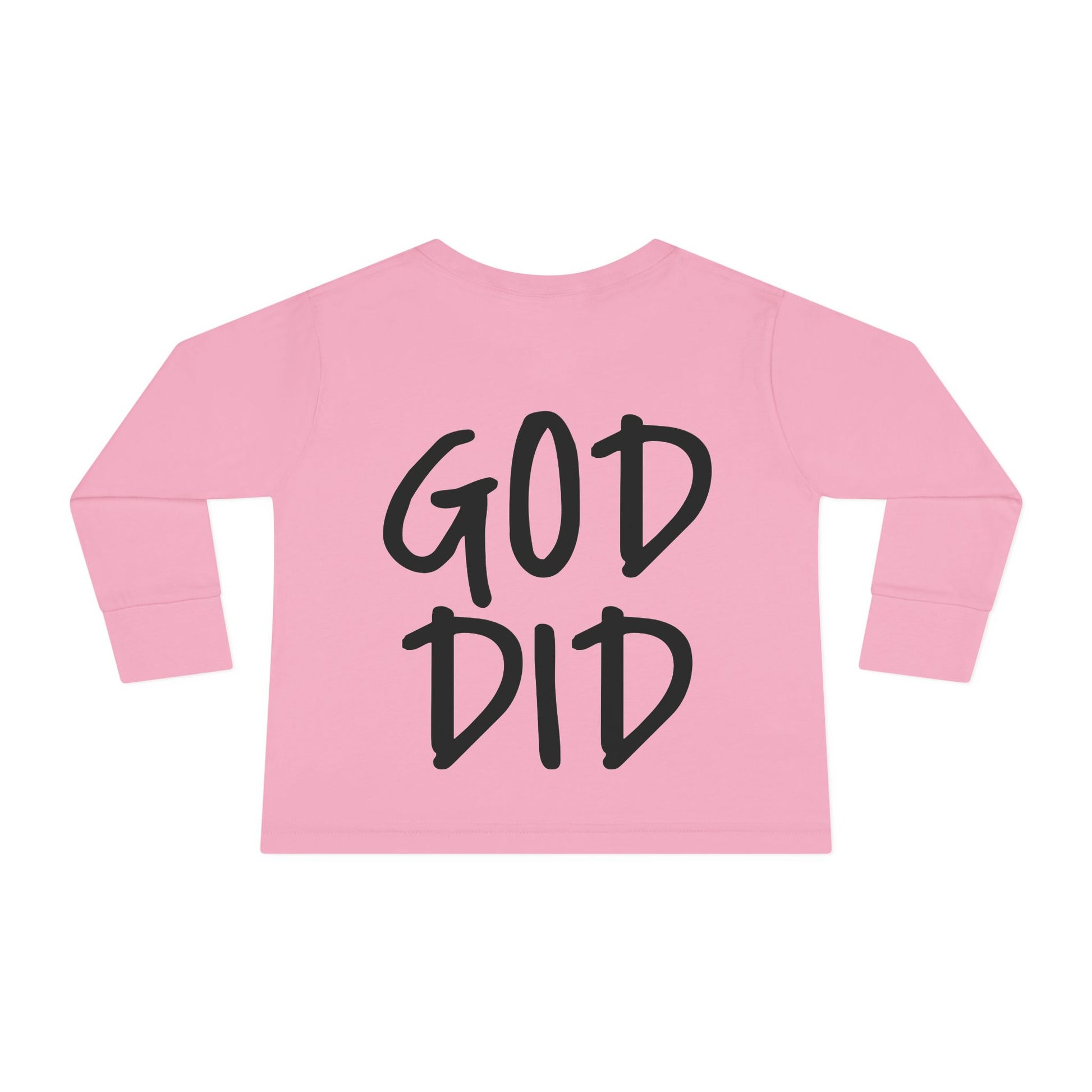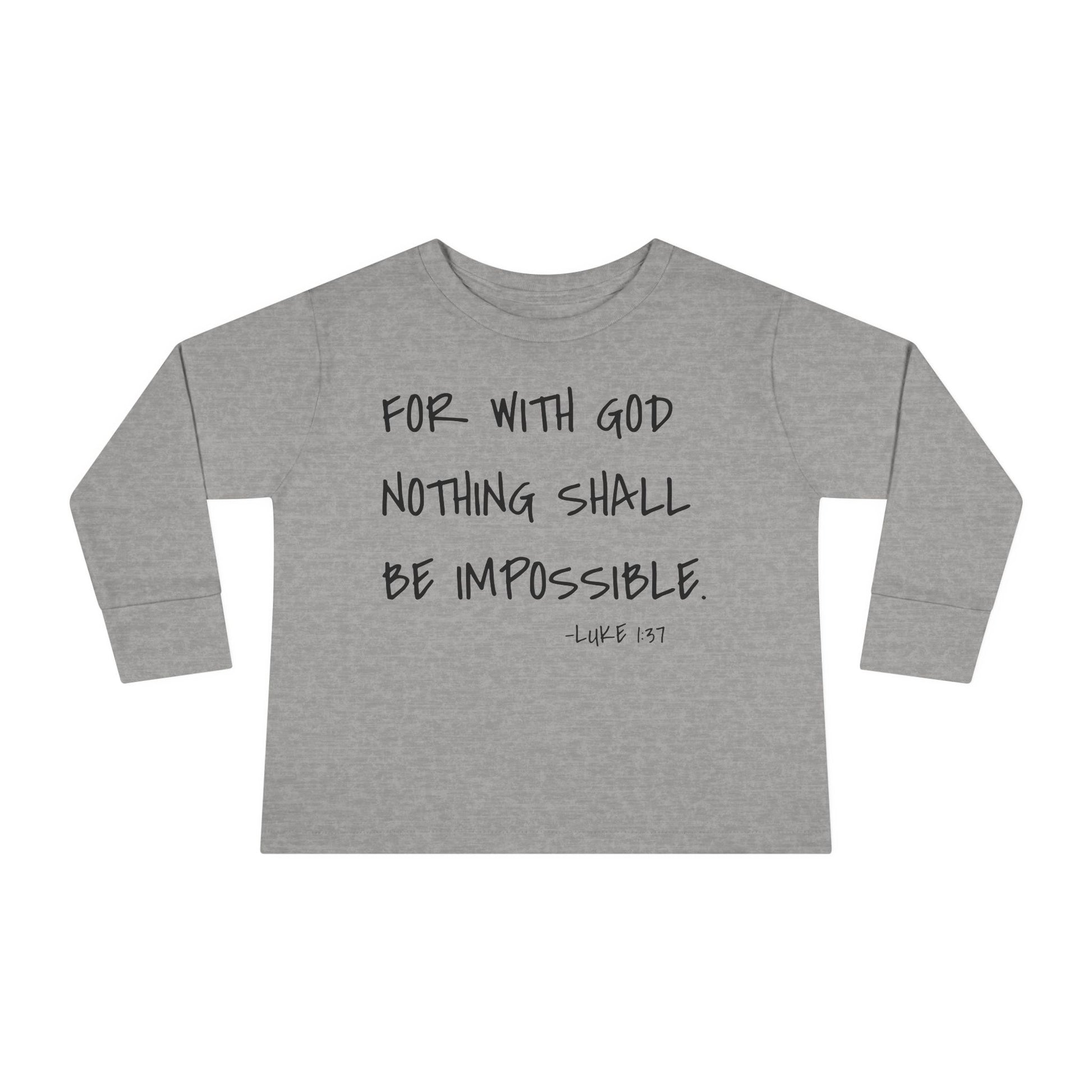 Big faith for little hearts. This toddler long sleeve tee brings comfort, style, and a message that matters — “God Did” boldly across the back and Luke 1:37 — “For with God nothing shall be impossible” — on the front. It’s a small shirt with a powerful reminder that faith starts early.